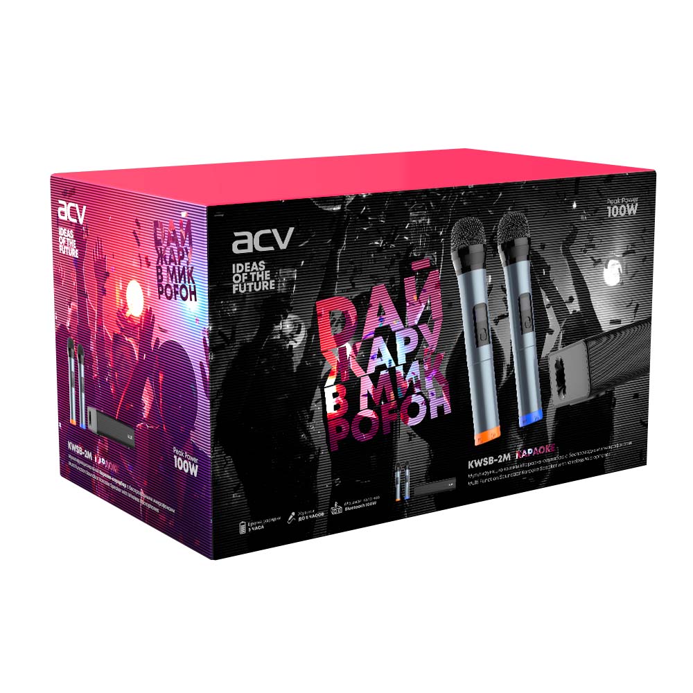 Универсальный караоке-саундбар представляет собой коммутационно-усилительный блок с модулями преобразования и обработки звуковой информации, позволяющий осуществлять функцию караоке с двух беспроводных радиомикрофонов. Система оснащена функцией Bluetooth колонки номинальной мощностью 20 Вт (10Вт*2).