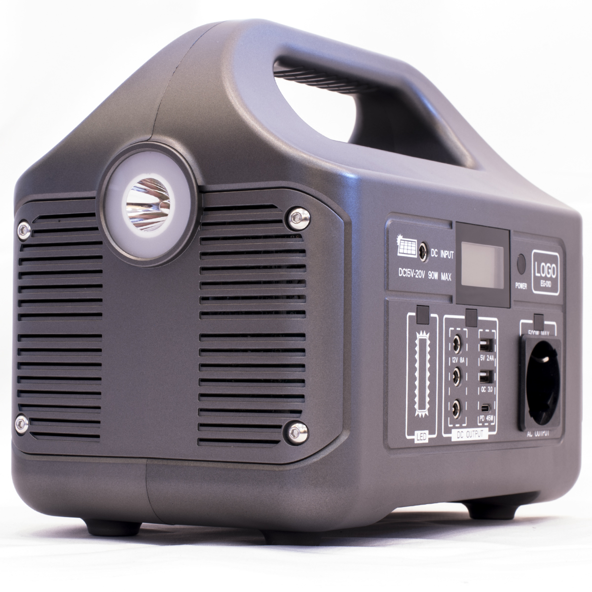 Эргономичный корпус зарядной электростанции 220 вольт имеет ручку для переноски, LED дисплей, встроенный фонарь и включает в себя полный набор необходимых портов. Зарядка самого устройства AV500PS осуществляется через обычную розетку.