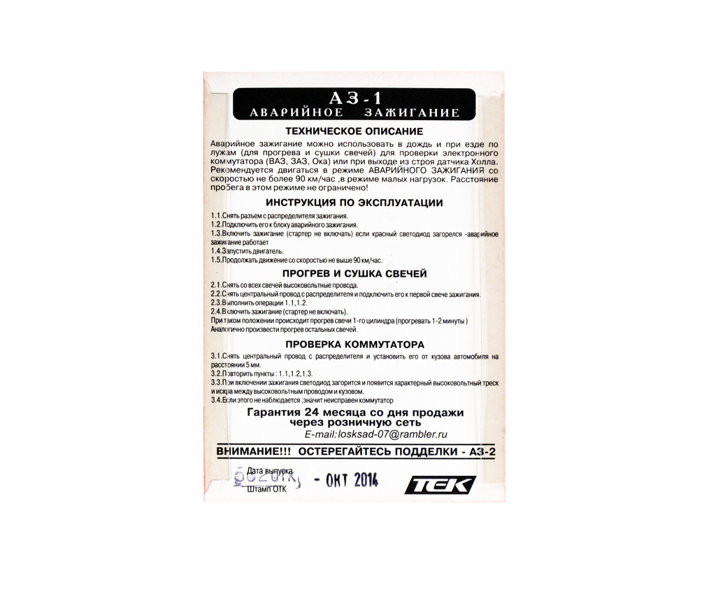 Модуль АЗ-1 используется в качестве аварийного зажигания при выходе из строя датчика Холла. Рекомендованная скорость движения не более 70 км/ч. Модуль можно использовать для прогрева и сушки свечей, для проверки электронного коммутатора.