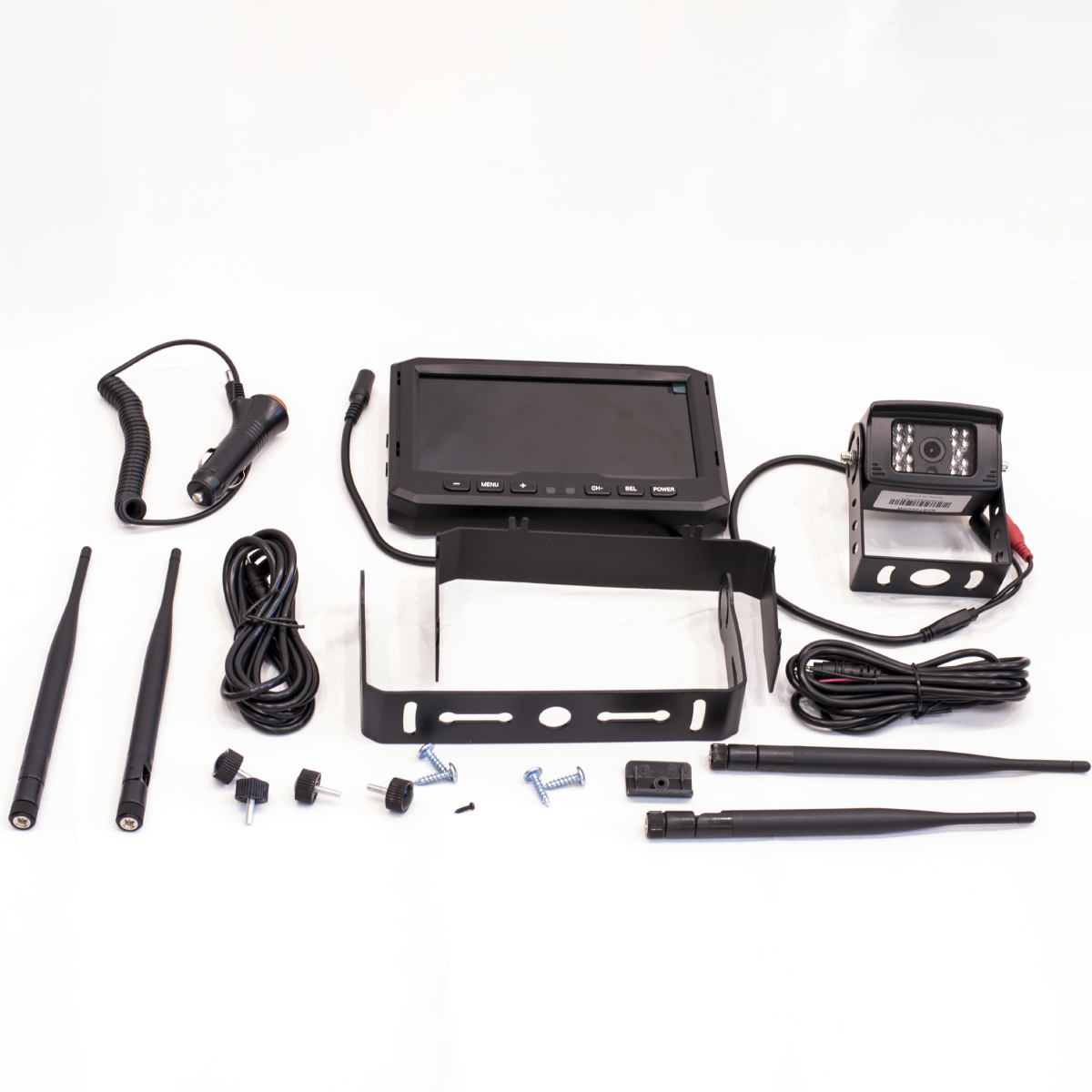 7-дюймовый беспроводной монитор транслирует чёткое и яркое изображение с камеры заднего обзора. Корпус монитора изготовлен из пластика в традиционном чёрном цвете. Благодаря антибликовому покрытию и солнцезащитному козырьку, изображение на экране остаётся хорошо видимым даже при ярком солнечном свете. К монитору можно подключить до 4 беспроводных камер. В данный комплект входит одна камера для парковки.