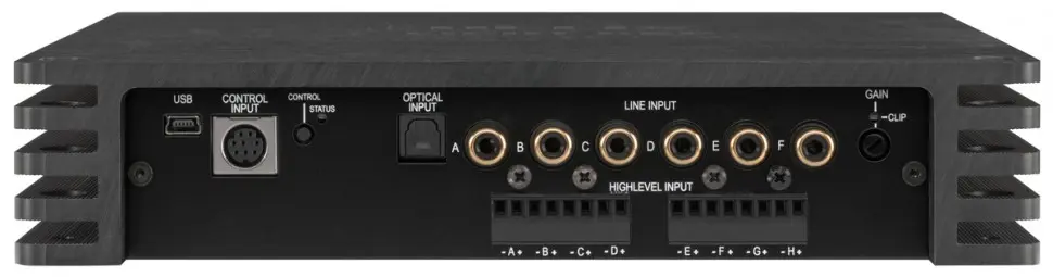 Процессорный усилитель мощности Helix V Eight DSP MK2 это гибрид 10-канального аудиопроцессора и 8-канального усилителя. Он имеет 8 высокоуровневых входов и возможность складывать поканальное усиление после штатного усилителя мощности. Также есть RCA-входы для подключения к головным устройствам с линейными выходами. Для цифровых источников звука имеется оптический вход Toslink.