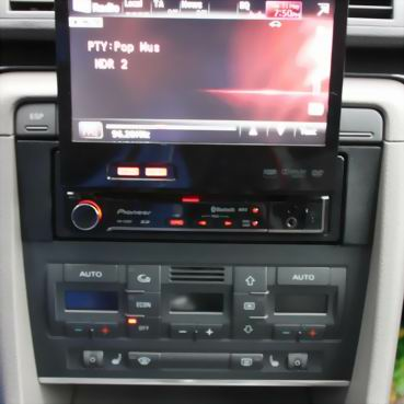 Универсальная переходная рамка для Audi A4 (B6) с 2000 по 2006 год выпуска для установки магнитол стандарта 1 DIN. Рамка по цвету и фактуре идентична салону автомобиля.