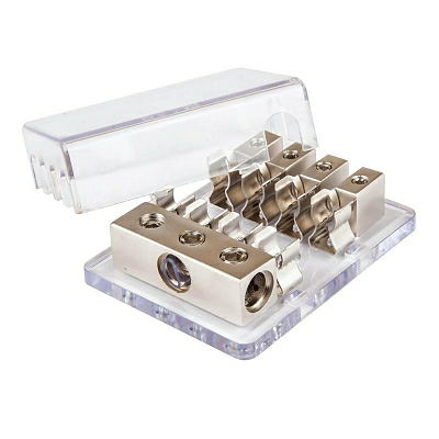 Автомобильный дистрибьютор питания. 3x0GA (53 мм2) или 3x2GA (33 мм2) входа/4x4GA (21 мм2) выхода.