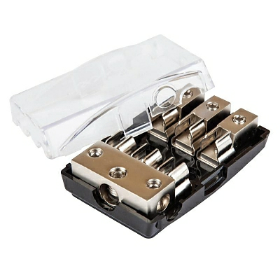 Автомобильный  дистрибьютор питания. 1x2GA (33 мм2) и 2x4GA (21 мм2) входа, 3x6GA (10 мм2) выхода или 3x8GA (8 мм2) выхода. 3 держателя для предохранителя типа AGU.