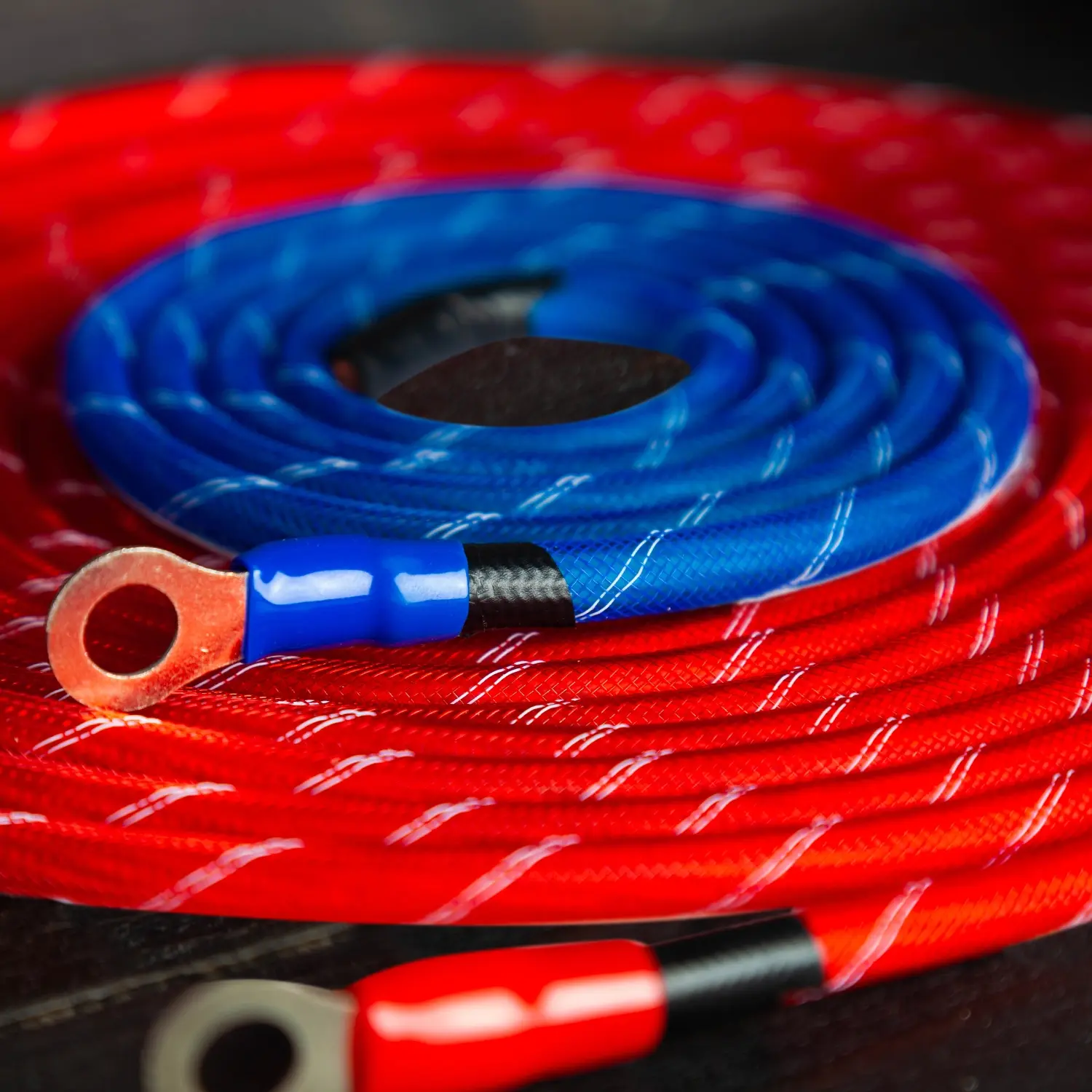 5м 8AWG силовой медно-алюминиевый кабель с матовой эластичной изоляцией в защитной оплетке из полиэстера красного цвета в сборе с силовой O-образной клеммой