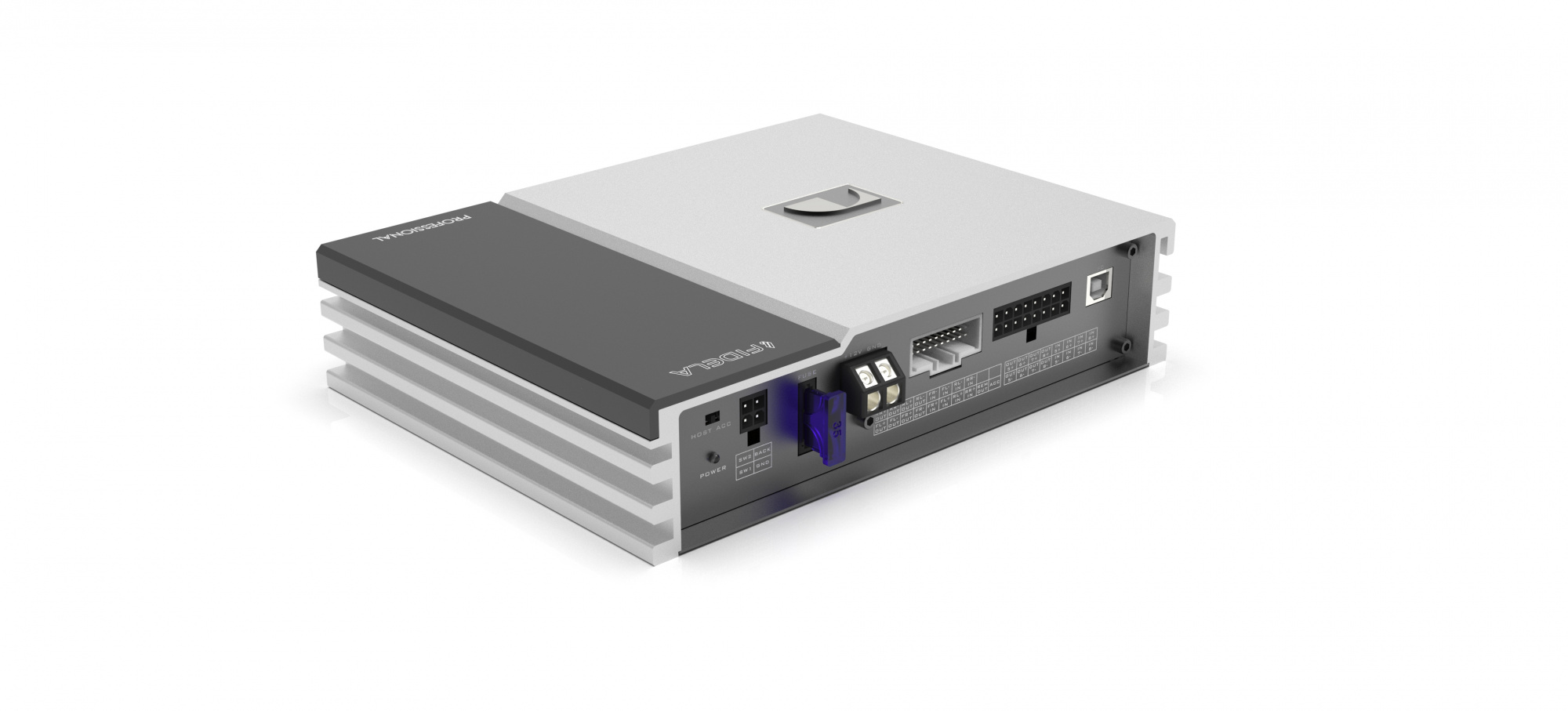 Автомобильный 8-канальный усилитель со встроенным 10-канальным аудиопроцессором AK7735EQ от Asahi Kasei Microdevices (AKM). Максимальная мощность 8 х 70 Вт. Для подключения к различным источникам сигнала усилитель оснащен 8-канальным входом высокого уровня HIGH INPUT, 2-канальным линейным входом RCA AUX и цифровым оптическим входом OPTICAL INPUT с разъемом TOSLINK.
