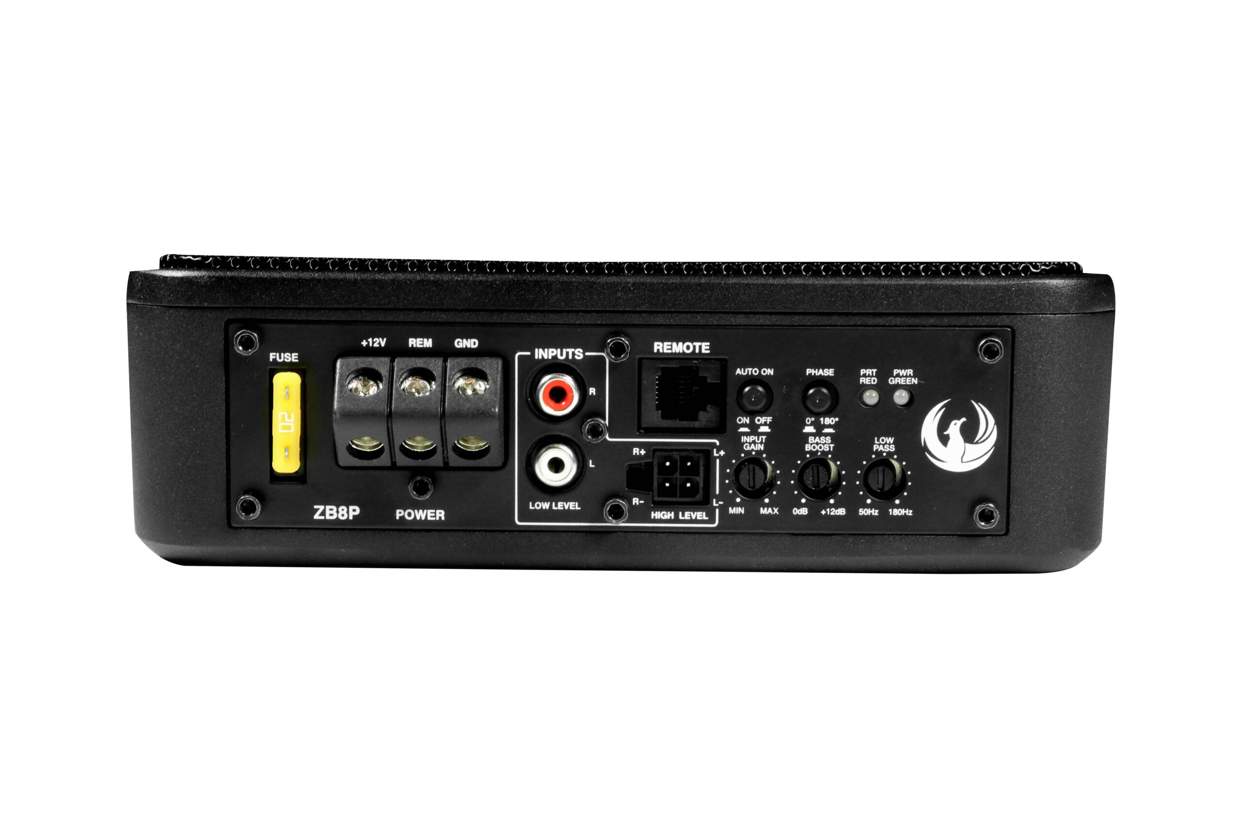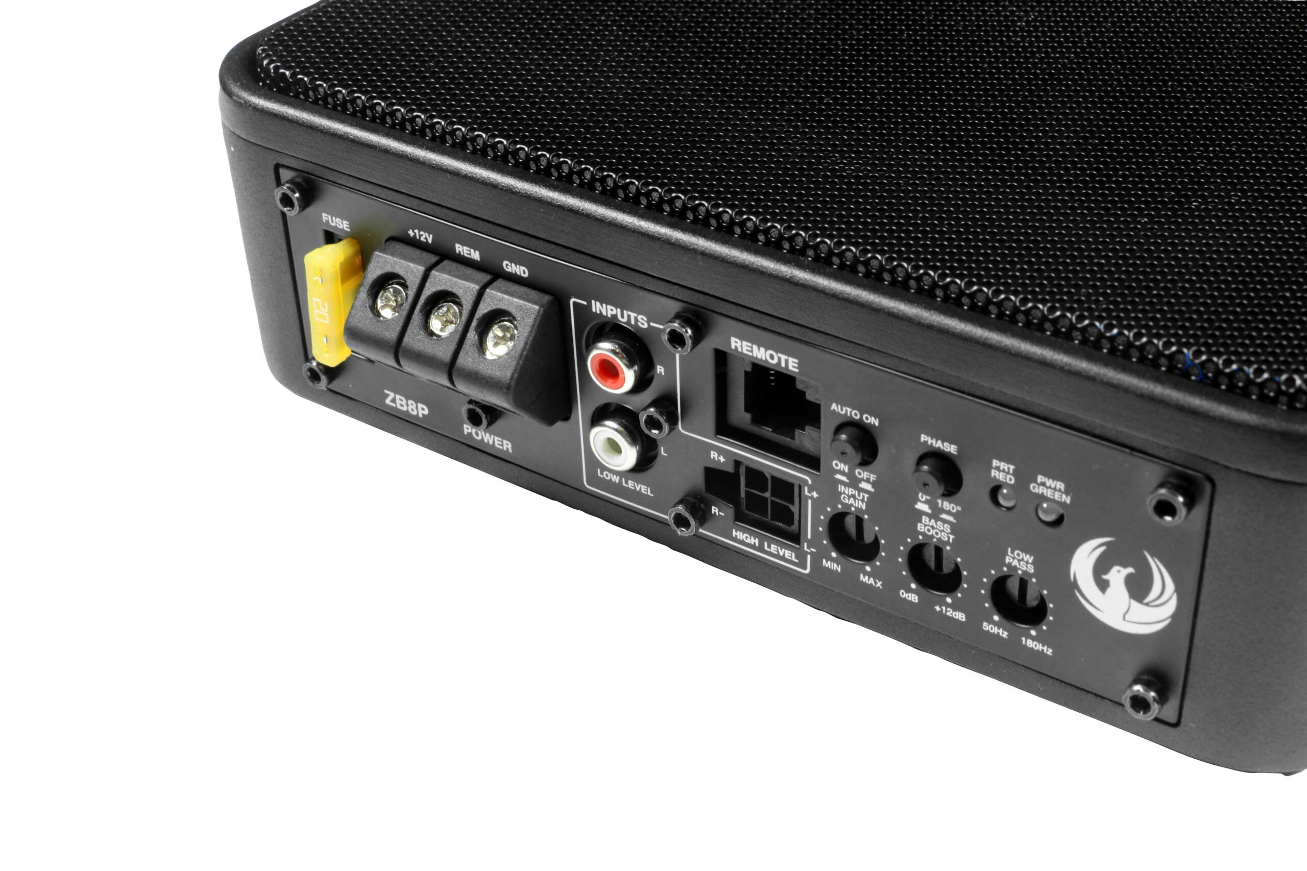 Низкочастотный динамик оснащен быстроразъемным соединением для быстрой и простой установки. ZB8P обладает всеми необходимыми функциями, такими как фильтр нижних частот, регулируемая фазовая коррекция, автоматическое включение и усиление басов. В комплект также входит 5-метровый пульт дистанционного управления для регулировки уровня басов с водительского сиденья.