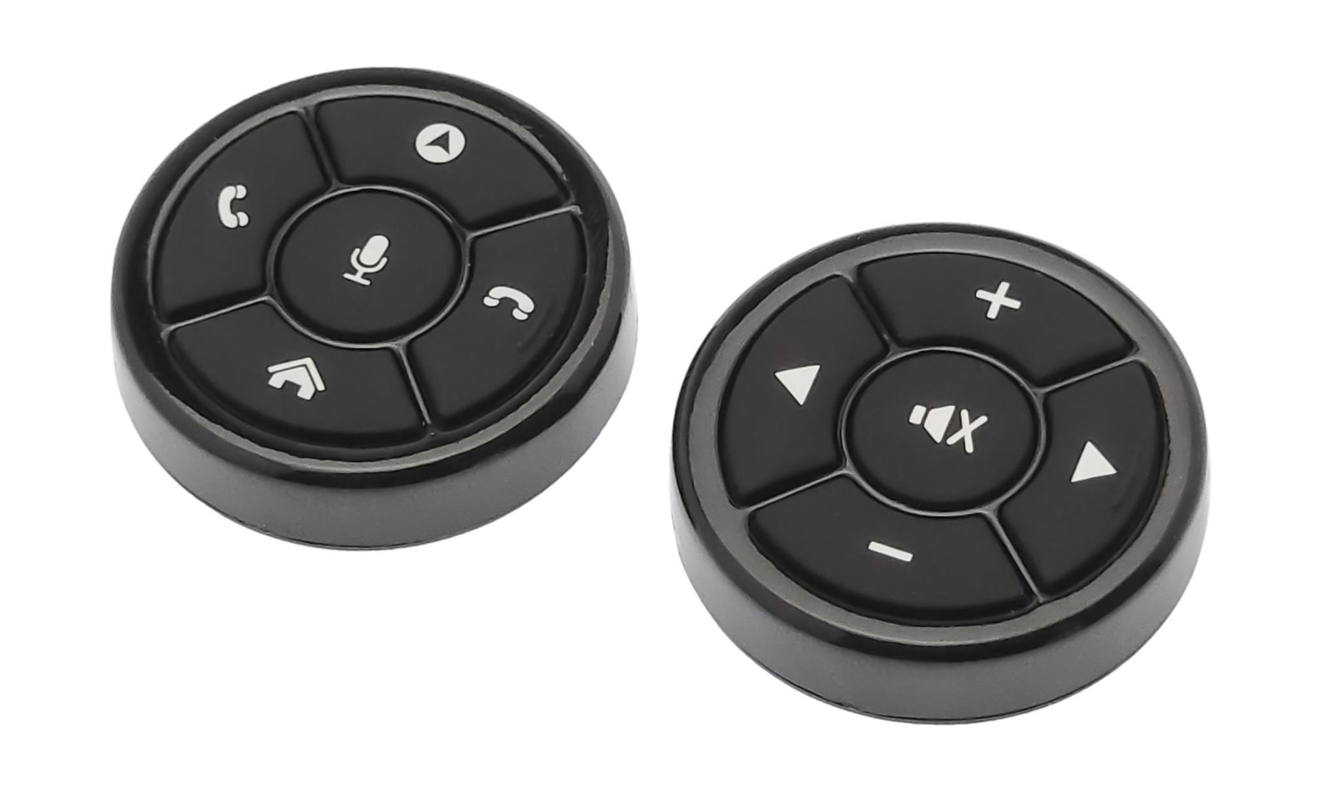 Данный пульт ДУ относится к условно беспроводным, так как в корпусе к кнопкам установлены элементы питания и беспроводной передатчик, а приемник сигнала, поставляемый в комплекте, подключается проводами непосредственно к разъему вашей новой магнитолы. Этот пульт устанавливается на широкие спицы рулевого колеса, или в любое другое удобное место. Его можно установить накладным способом на поверхность на двухсторонний скотч, а можно утопить внутрь (в комплекте поставки идут специальные монтажные приспособления). На данном устройстве находится 10-ть кнопок, которые можно запрограммировать любыми функциями, которые позволяет ваша новая магнитола. Но производитель продумал пиктограммы на кнопках так, что правая часть рулевого колеса будет отвечать за перелистывание треков и громкость, а левая за все остальное. Пожалуй, это очень разумное решение.