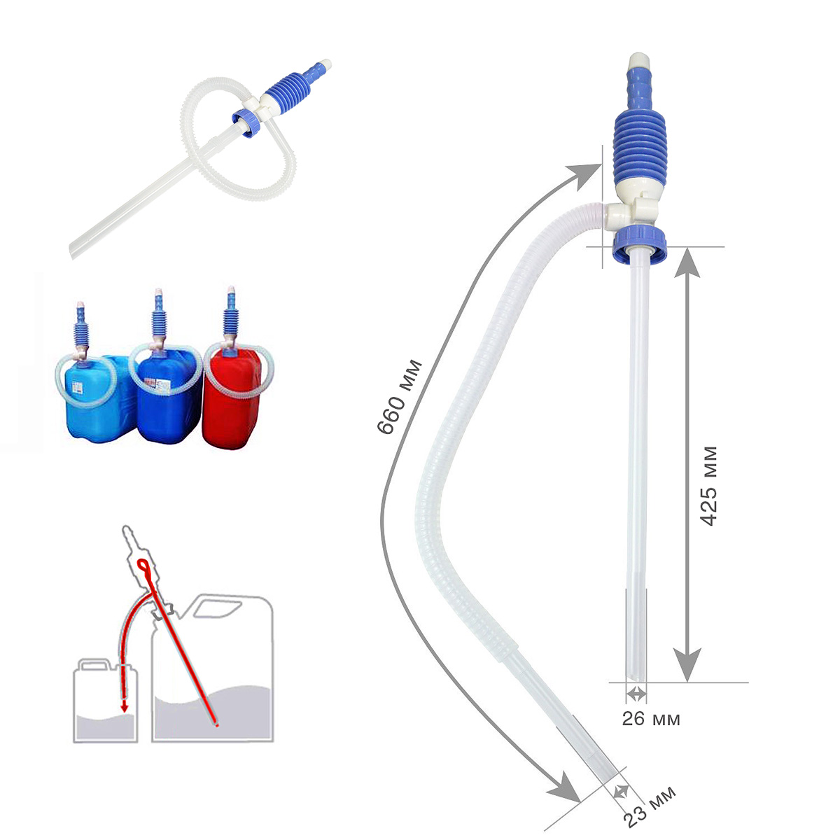 Помогает решить проблемы, связанные с перекачкой технических жидкостей, а также используется для заправки бензоинструмента, специальных транспортных средств и в бытовых нуждах (например, слив и обслуживание аквариумов).