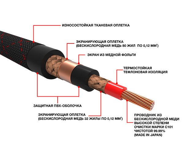 Экранирование Тройной экран для защиты от помех и наводок (сетка из чистой бескислородной меди состоящая из 12 жил сечением 0,12 мм каждая+медная фольга + сетка из чистой бескислородной меди состоящая из 80 жил сечением 0,12 мм каждая)
